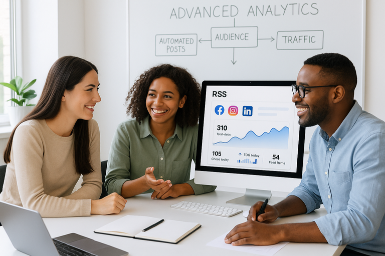 Conecte cualquier fuente RSS para buscar, programar y publicar automáticamente contenido nuevo en todos sus canales sociales. Mantenga activos sus perfiles sin esfuerzo con noticias, publicaciones de blogs o actualizaciones de cualquier sitio web, siempre actualizados, incluso cuando no esté conectado.